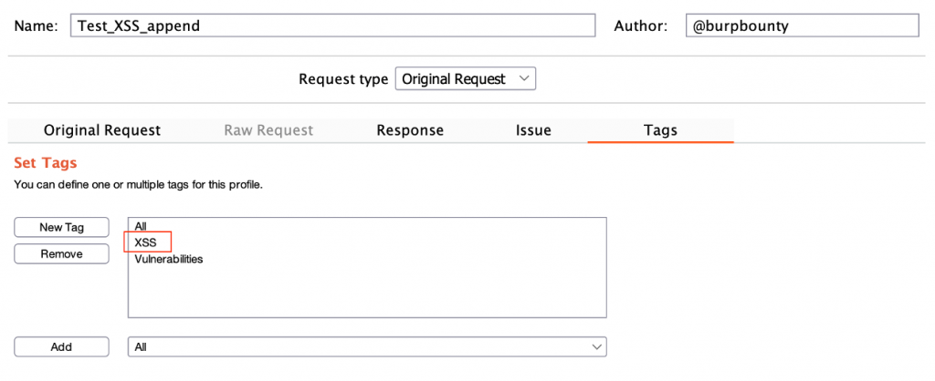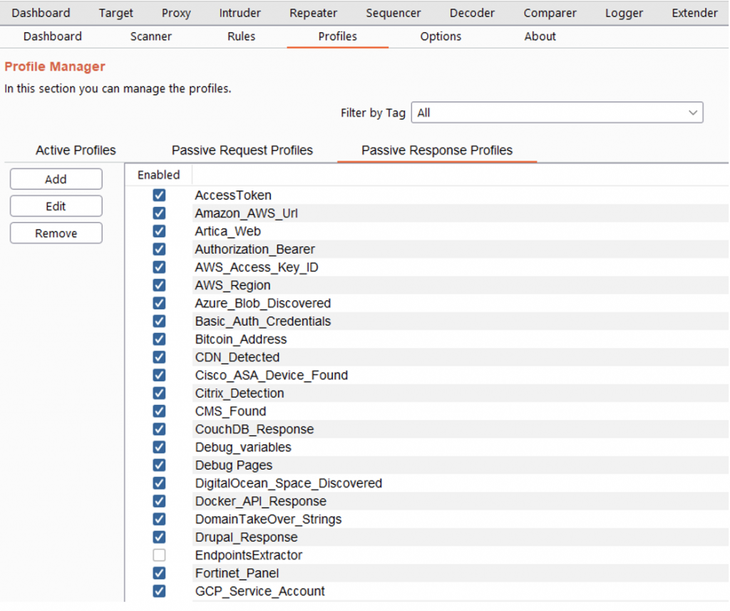 If you scan one or multiple requests with the Active scan, you will launch against the request all the profiles that are active in the tab “Profiles-> Active Profiles”. If you scan a request, several request or one entire domain with “Active Scan->Some TAG”, the profiles that are tagged with “Some TAG” will be launched on that request/requests. For example, if you scan with Active Scan->XSS, the profiles tagged with the XSS tag will be launched on the request/requests.