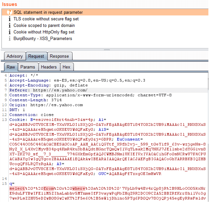 In next image, you can see how it detects an SQL statement in The HTTP Request. As you can see below, a “select” is detected followed by a “from” followed by “where”.