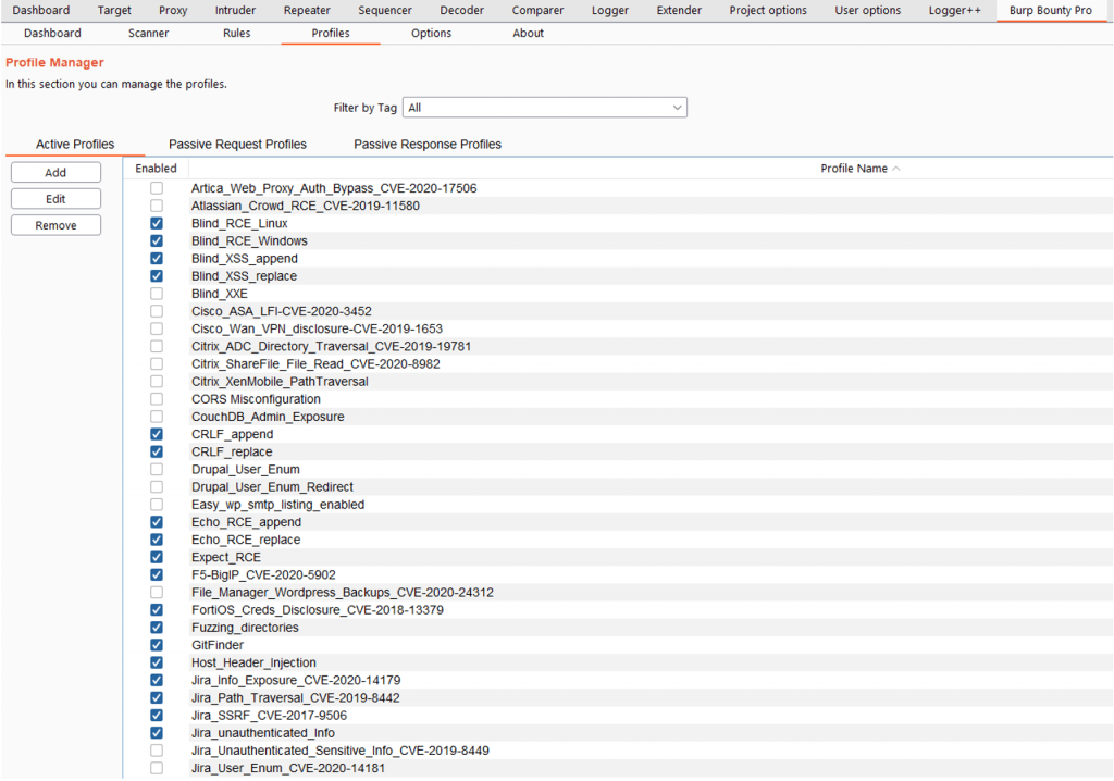 If you scan one or multiple requests with the Active scan, you will launch against the request all the profiles that are active in the tab “Profiles-> Active Profiles”. If you scan a request, several request or one entire domain with “Active Scan->Some TAG”, the profiles that are tagged with “Some TAG” will be launched on that request/requests. For example, if you scan with Active Scan->XSS, the profiles tagged with the XSS tag will be launched on the request/requests.